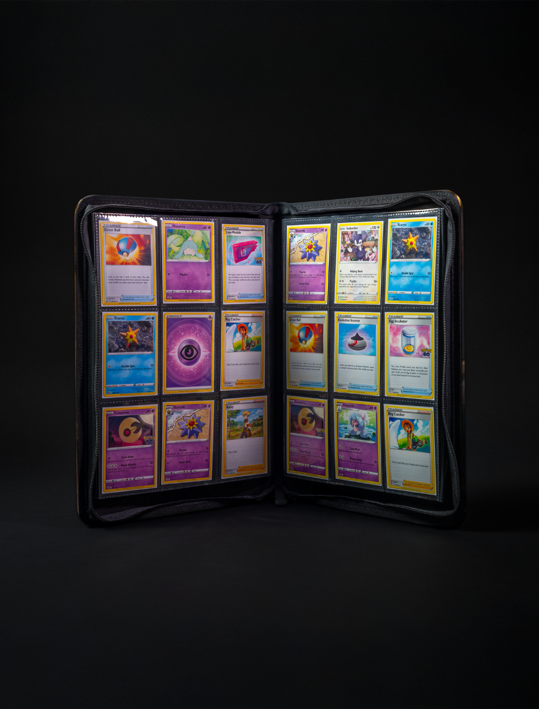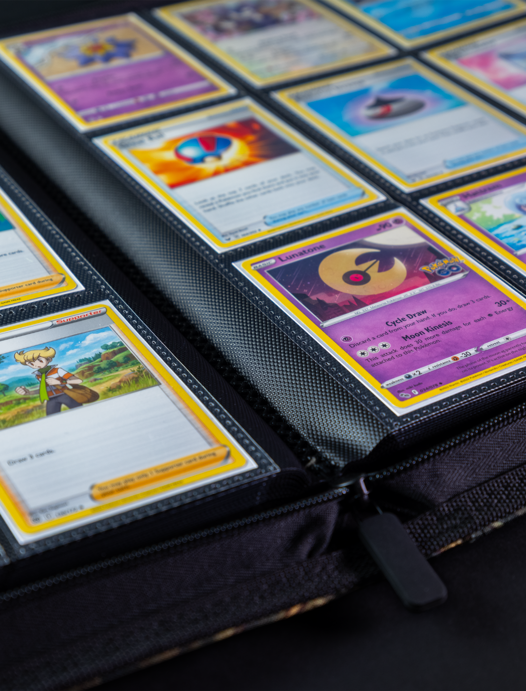 Diseño Completo Delantero y Trasero | Superficie de Tela | Logo Japonés Cosido | 360 Bolsillos, Cierre de Cremallera, Resistente al Agua | Compatible con Yu-Gi-Oh, Pokemon, Magic The Gathering, Cartas Deportivas y Más | Piel de PU de Primera Calidad y Páginas a Doble Cara