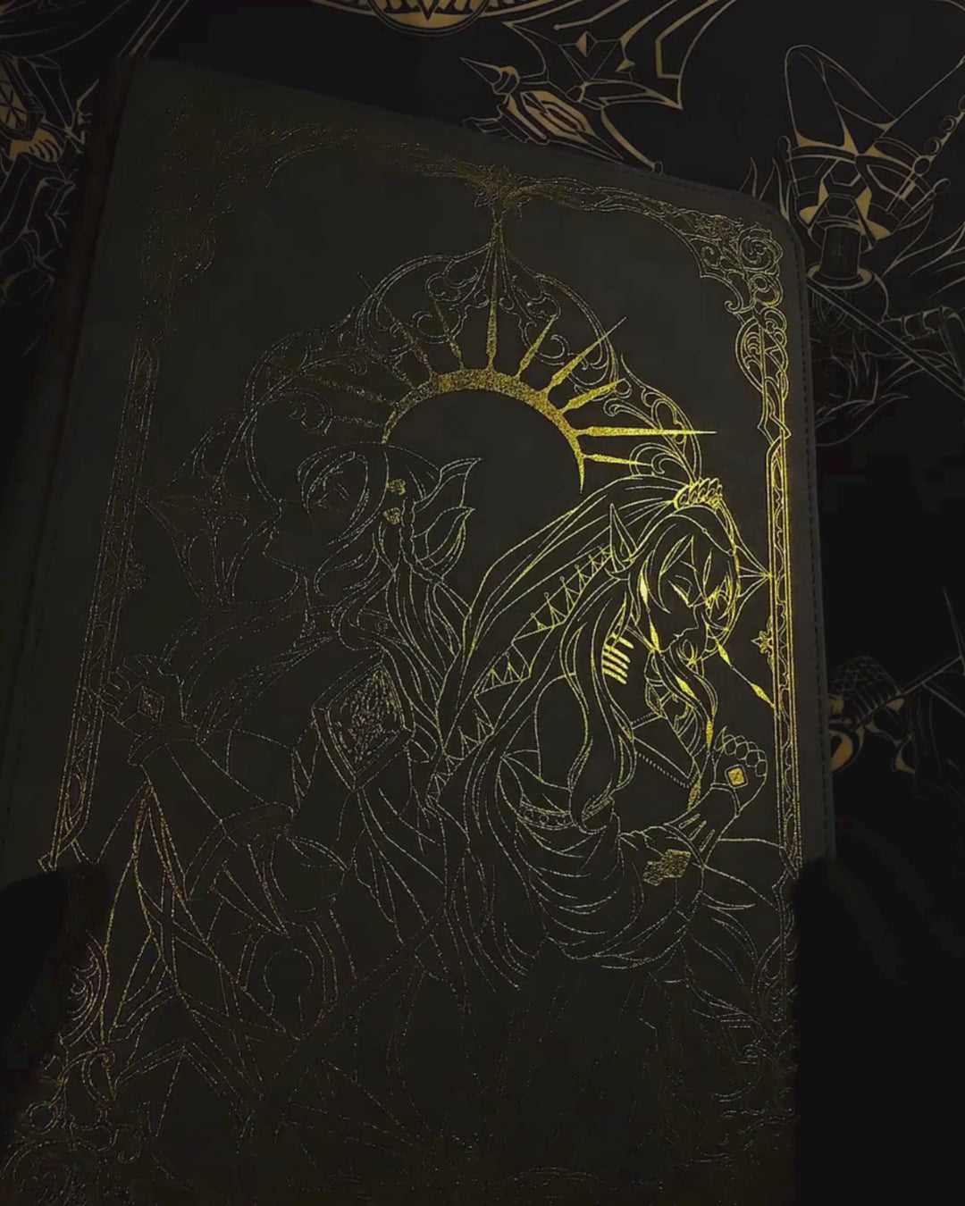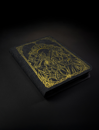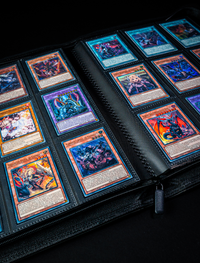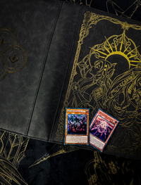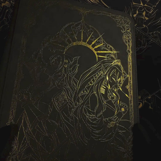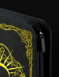 Dark Grey Premium Vintage Leather | Golden Shatter Foil Line Art Design on the Front and Back| Premium Quality | 360 Pockets, Zipper Closure, Water-Resistant | Compatible with Yu-Gi-Oh, Pokemon, Magic The Gathering, Sports Cards, and More |