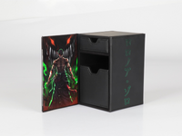 Holds 120 cards with standard sleeves or smaller formats and 100 cards with double sleeves. Has a special Dice Tray and smooth leather surface!
