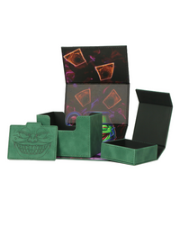 Holds 120 cards with standard sleeves or smaller formats and 100 cards with double sleeves.