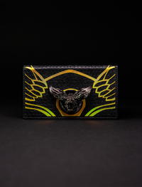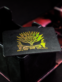 A Black Shiny Metal Emblem of the Dragons Head is placed in the Center of the Deckbox Front. Surrounded by a Multicolored Holo Foiling Pattern on the Box and Divider!