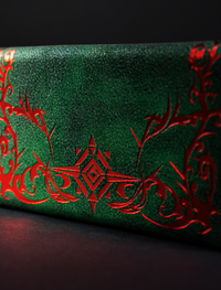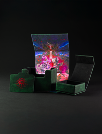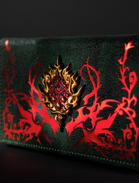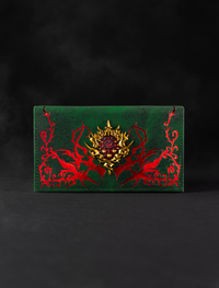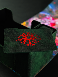 This Deckbox has a Full Color Metal Emblem and Shiny Red Engravings .